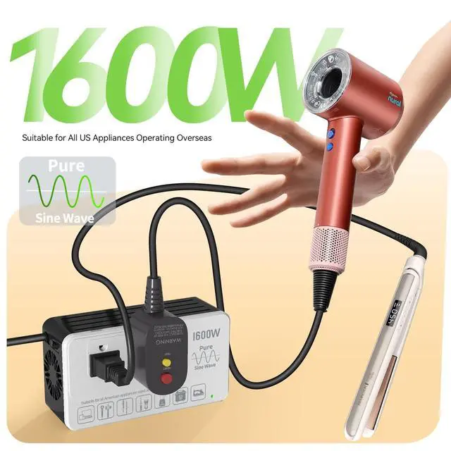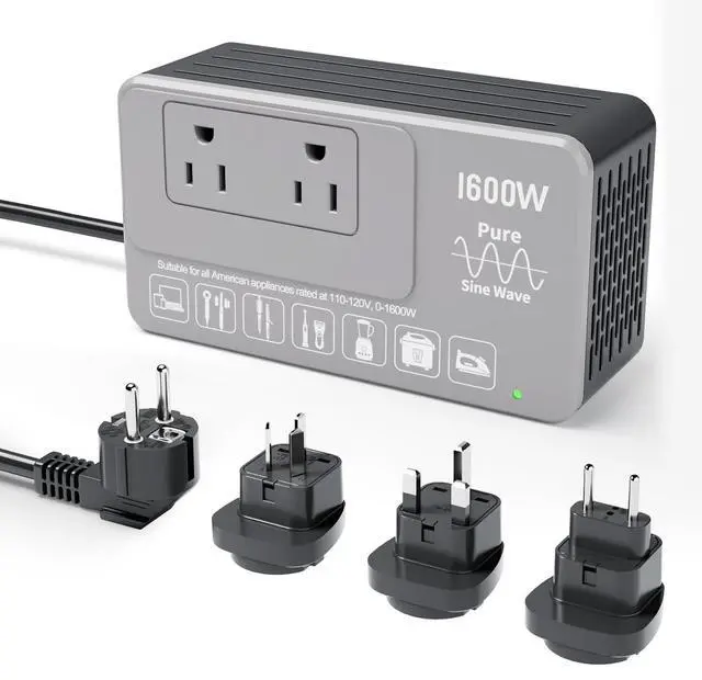 Eleclead 1600W Pure Sine Wave 220V to 110V Voltage ConverterEasily convert 220250V to a stable 120V pure sine waveideal for safely using U. S. appliances (110120V, up to 1600W) while traveling abroad. Comes with 4 international plug adapters for use in 160+ countries. Built-in advanced safety protections and smart fault detection ensure long-lasting reliability. No fuse replacement needed. Compact, powerful, and backed by a 2-year warranty.