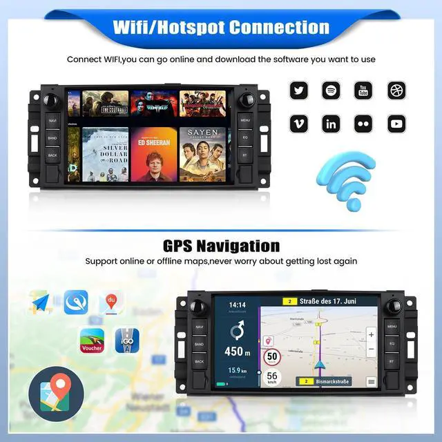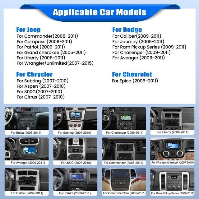 CHEVROLET: Epica (2006-2011), CHRYSLER: Sebring (2007-2010), Aspen (2007-2010), 300C (2007-2010), Cirrus (2007-2010), JEEP: Commander (2008-2011), Compass (2009-2011), Patriot (2009-2011), Grand cherokee (2005-2011), Liberty (2008-2011), Wrangler/unlimited2007-2015, DODGE: Caliber (2009-2011), Journey (2009-2011), Ram Pickup Series (2009-2011), Challenger (2009-2011), Avenger (2009-2011) ^^ Compatible with Wireless Carplay & Android Auto&Mirror LinkThis car stereo for Jeep Wrangler JK Compass supports CarPlay/Android Auto function. Just connect Bluetooth, you can project the contents of your phone to the large screen of the host, and you can share your favorite 1080P videos, high-definition pictures, etc. Easily access your phone to make calls, navigate, play music or manage other apps via Siri/Gg controls.