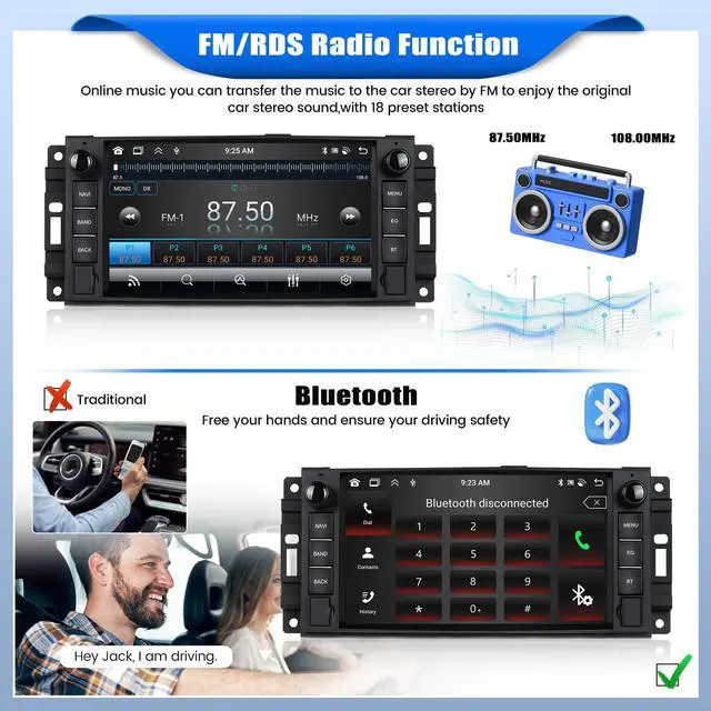 Upgrade dual system mirror link: IOS/Android mirror link ^^ EQ Setting&DSPCar DSP tuning software, using DSP tuning technology, you can adjust the frequency, AE, 36-band equalization, and sound type selection on the app to make up for the lack of the original car speakers and obtain better lossless sound quality. Smart voice assistant, you can voice control it to make calls, control map navigation, send text messages, etc. It can better liberate your hands and achieve safe driving ^^ FM/RDS Radio Receiver &BluetoothBluetooth allows you effectively share music from mobile phone to the car stereo, answer phone call by hand free, calling and hang up phone with just one push of a button, daily driving easier and safer. Build in FM, automotive level chipset provides the best radio signal reception performance, lets enjoy the best FM station and and drive with the rhythm of the city ^^ Steering Wheel Control &AHD Rear View CameraThe car radio for Jeep Wrangler JK Compass supports the car steering wheel to remote control the radio panel, including switching songs, switching channels, adjusting volume, answering calls, etc.
