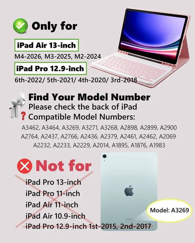 Model CompatibilityDesigned Only for iPad Air 13 inch (M4-2026, M3-2025, M2-2024) & iPad Pro 12.9 inch (6th, 5th, 4th, 3rd Generation), Not compatible with other models. You can check the model number before purchasing to make sure you get the correct size tablet keyboard case. ^^ Removable Magnetic Dazzle Backlit KeyboardiPad Air 13 inch (2026/2025/2024) & iPad Pro 12.9 inch (2018-2022) cases come with a removable magnetic dazzle backlit keyboard. The ultra-thin, lightweight magnetic keyboard attaches securely to the case, helping the tablet stand upright and turn it into a mini laptop in a second.