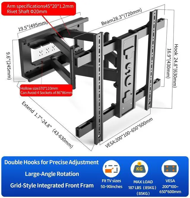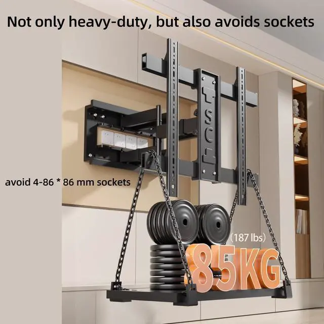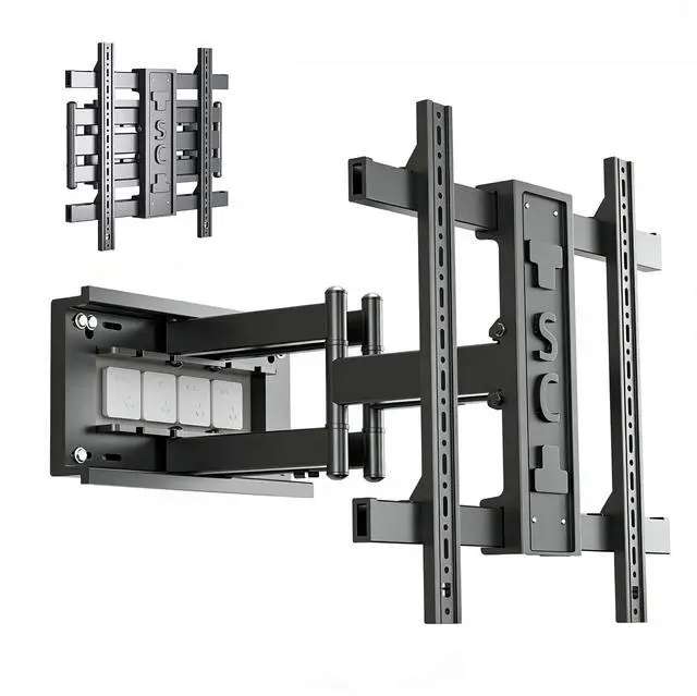 Durable: The 6 articulated arms of the TV stand are made of cold-rolled steel, and the fully enclosed one-piece front frame is more immutable, In addition, the integrated stamping wall panel can avoid 4 sockets sized 86*86mm, Can be installed in a Living Room Bedroom Kitchen and Office ^^