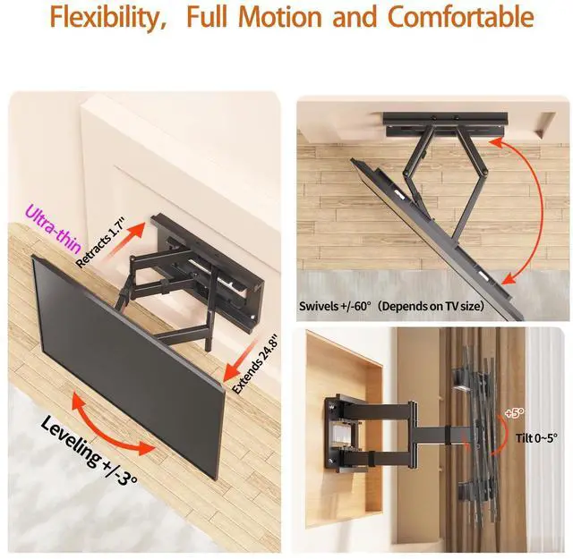 FlexibilityFull motionComfortable: The Ultra Slim full motion TV wall mount is fully adjustable to your comfortable viewing angle for a high quality viewing experience, swivels +/-60without tools, tilts 0~+5 to reduce glare, Leveling +/-3, long extends up to 24.8 inches and ultra-thin retracts to 1.7 inches can both adjust the viewing distance and save space ^^ Quick &Easy