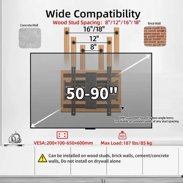 Wide Compatible: The Universal Ultra-Thin TV Wall Mount is specially designed to fit almost flat and curved 50-90" Large TVs up to 187 LBS, with VESA patterns 200x100 to 650x600mm; VESA Patterns include 200x100mm 200x200mm 200x300mm 300x200mm 300x300mm 300x400mm 400x400mm 400x500mm 500x400mm 500x500mm 600x400mm 600x500mm, 600x600mm, 650x600mm ^^