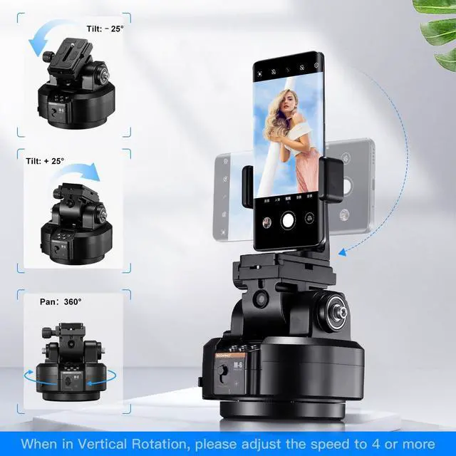 Auto Face Tracking FunctionBuilt-in auto face/human body recognition function. No need to download app or connect Bluetooth. 360 omni-directional tracking of every angle, suitable for live streaming, interview, outdoor shooting, shooting alone, etc. ^^ Hand Gestures Recognition to Start/StopSupport hand gestures to start or stop, making photography more easier. OK gesture to start tracking function and Stop (show your palm) to stop tracking. ^^ 360 Horizontal & Tilt 50 Adjustment Soonpho M6 Panoramic Tripod Head support 360 horizontal rotation and 25 tilt angle adjustments. With rotation speed of 8-level adjustable, you can easily shoot panoramic blockbusters, adjust the angle of your live device, and easily control the camera view.