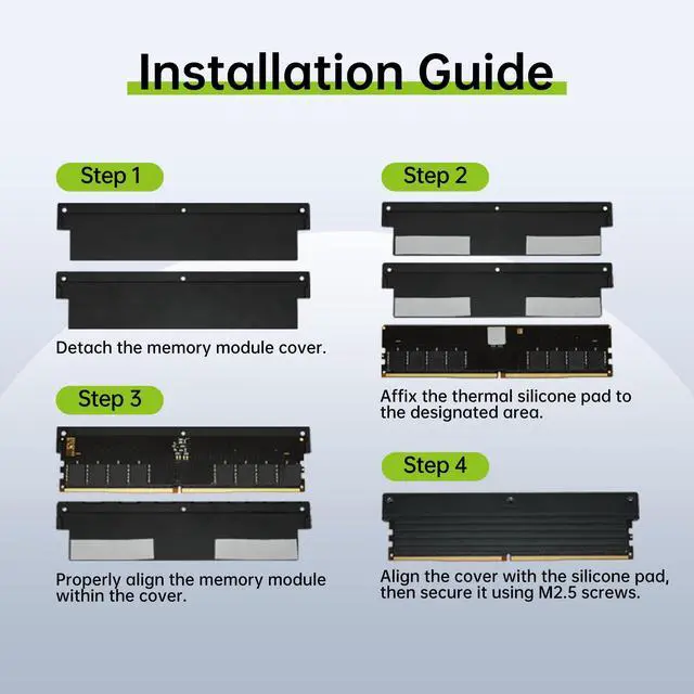 Tailored for DDR5 Tailored to maximize the potential of DDR5 memory, ensuring seamless compatibility and rock-solid performance. ^^ CNC Machined Aluminum AlloyPrecision CNC-machined aluminum provides unmatched durability and corrosion resistance while adding a touch of sleek sophistication to your setup. ^^ Heat Spreader Design for Optimal CoolingHigh-performance thermal materials ensure superior cooling, enhancing memory performance and reliability even under intense workloads. ^^ Easy InstallationDesigned for simplicity, installation is quick and easy, requiring no specialized tools or technical expertise. ^^ DDR5 Memory Modules Not IncludedThe casing only provides protection and cooling functions and does not include DDR5 memory modules.