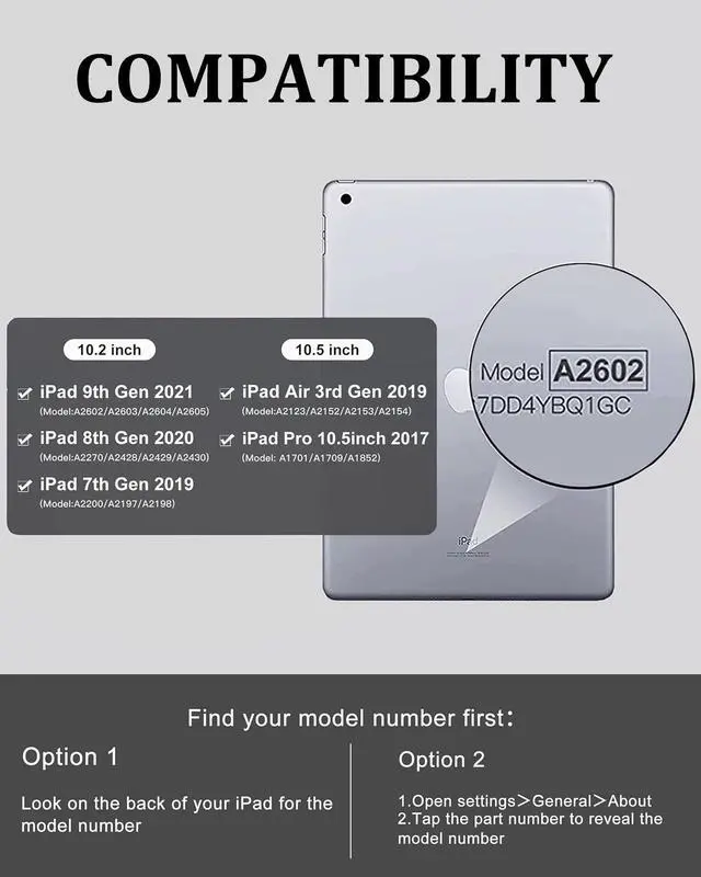 Model Number: A2602/A2603/A2604/A2605, A2270/A2428/A2429/A2430, A2197/A2200/A2198. Please check the model number starting with "A" on the back of your iPad before purchasing. ^^ Magnetic Folding Leather Case - Sturdy Premium PU cover and soft, anti-slip rubber-lined interior provides full protection for your iPad 9th Gen. Support 3 adjustable viewing angle and built in anti-slip grooves. Excellent for home, school, office, travel or business. ^^ Wireless Detachable Keyboard - Comes with magnetic, removeable, slim( 6.5 mm) and lightweight Bluetooth keyboard with 10 m range. If you carry our iPad keyboard case outside for working writing panting or playing, you will definitely see it as your new favourite tool. Folio iPad Case keyboard provide maximum protection & productivity for your iPad with minimal bulk. ^^ Stable Bluetooth Connection - Convenient and fast Bluetooth connection allows you to use the keyboard anywhere, anytime. And its keys are quiet and comfortable. The ipad keyboard 9th generation comes with power-saving mode, long periods of non-use will enter the hibernation state. ^^ iPad Keyboard Case 9th Generation - No more worrying about not being able to use your ipad in many places, having the D DINGRICH iPad 9th gen case with keyboard will help you make it.