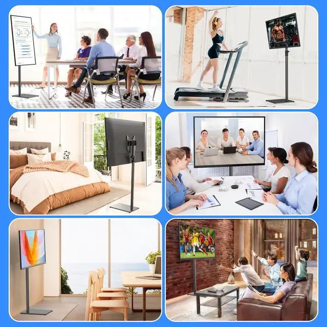 WIDE COMPATIBILITYThis TV stand is designed to accommodate most 12 to 43 inch LCD/LED flat screen or curved TVs, supporting VESA patterns including 3x3, 4x4, 7.8 x4, and 7.8 x 7.8 inches. ^^ 360 SWIVEL FUNCTIONThe TV stand features a full 360-degree swivel capability, allowing smooth left and right rotation to achieve optimal viewing angles in any room configuration. ^^ FLEXIBLE HEIGHT SETTINGSWith four adjustable height levels spaced 6.5 inches apart, this TV stand offers versatile positioning options ranging from 47.2 to 70.1 inches to suit various viewing preferences. ^^ COMFORTABLE VIEWING TILTEnjoy customizable comfort with the TV stand's 15-degree adjustable tilt function, designed to reduce neck strain and enhance your viewing experience.
