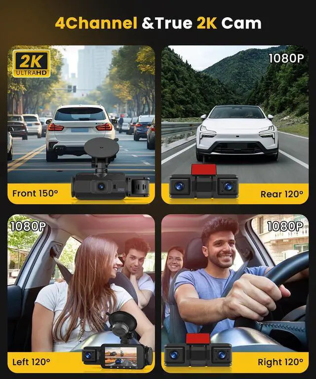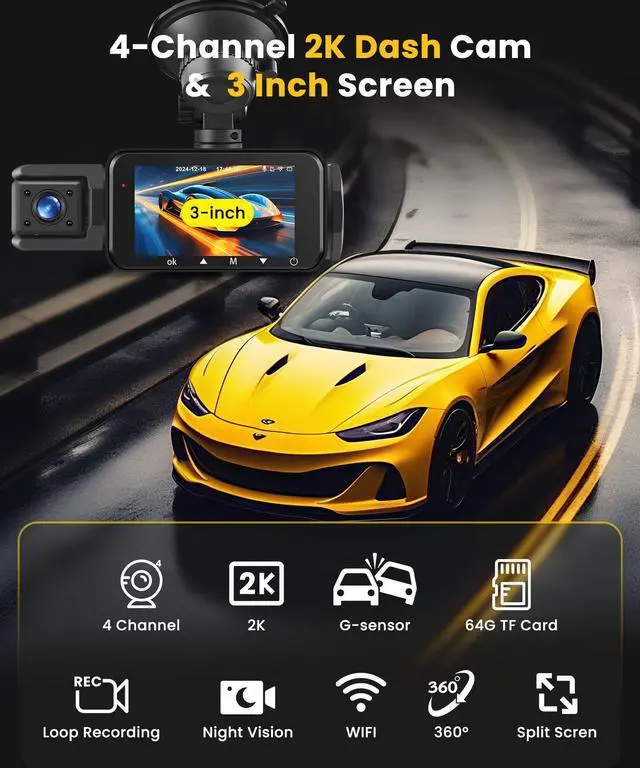 PLEASE NOTE: That to maintain the recording, you need to purchase additional wiring harnesses ^^ Night Vision & Face Recognition The exposure adjustment function of the car cameras dash cam ensures safe driving by capturing details without annoying overexposure even in dark and super-light environments. The 4 channel dash camera are equipped with a lightless night vision function, which clearly recognizes faces. ^^ 64G TF Card & Loop Recording Dash camera for cars supports Loop Recording, When the SD card is full of memory, the oldest video will be automatically overwritten, but the locked video content will be retained, so there is no need to worry about it disappearing. The 64Card is included in the package. (no additional purchase)