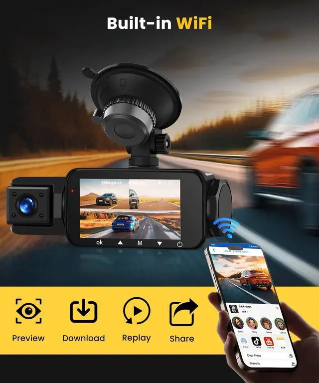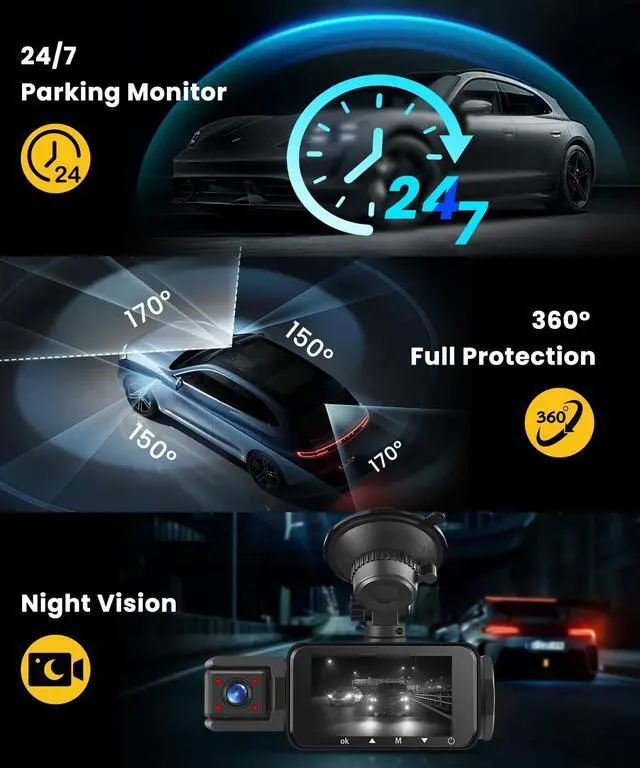Please NoteThe dash cam touch screen comes with protective film on the lenses, which should be removed before use. Besides, the 24-hour monitoring function requires an extra wiring harness to be applicable. If you need it, please let us know and note W8130TY. Thank you for your understanding. ^^ 3inch Touchscreen &360& 4 Cameras The 3-inch IPS touchscreen, comes with a true 2K front-view camera and Left Right Rear three 1080P HD cameras, 360 camera helps you observe your surroundings in a full view without any blind spots. The suction cup design can be firmly installed at any position on your vehicle ^^ 5GhzWiFi / APP Control Build-in Dash cam WiFi support 5Ghz WiFi, which the signal transmission is faster and the video playback is smoother.