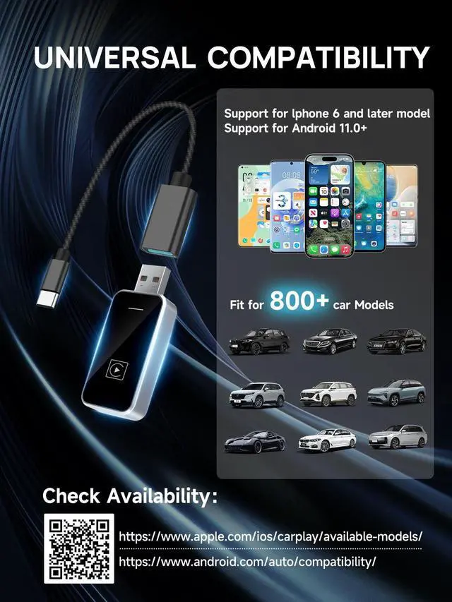^^ Universal Compatibility: This wireless android auto is compatible with more than 800 car models, including cars produced in 2016 and later and IOS 10 / Android 11 and above systems (please confirm whether the car supports wired CarPlay). Mini wireless carplay adapter, which can add CarPlay wireless function to most cars for Apple wired.