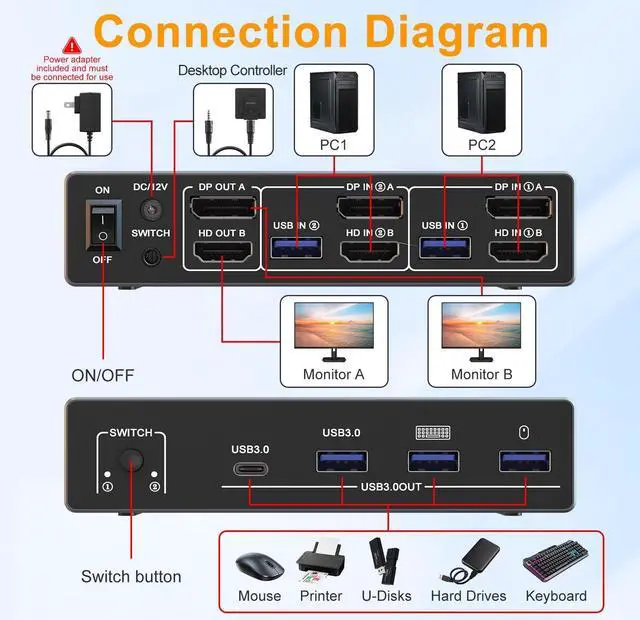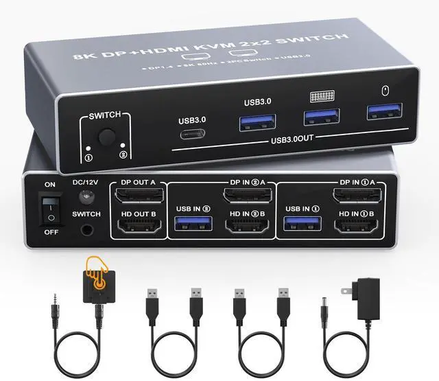 Note: Please use standard 8K cables to achieve peak resolution performance. ^^ [High-Speed USB 3.0 Connectivity] Boost your productivity with an integrated hub featuring 4 USB 3.0 ports (3 USB-A + 1 USB-C). As a high-performance kvm switch dual monitor solution, it offers data transfer speeds up to 5Gbps10x faster than USB 2.0. Sync your printer, webcam, and hard drives instantly without the hassle of constantly swapping cables between your two systems. ^^ [Flexible Dual-Switching Methods] Take total command of your desktop with two convenient switching options. This dual monitor kvm switch includes a wired desktop controller for discreet cable management and a responsive front-panel button for quick toggling. This 2 computer 2 monitor kvm switch design allows you to hide the main unit, keeping your workspace clean and professional. ^^ [Pro-Grade Stability & Power] Engineered for heavy-duty use, our kvm switch 2 monitors 2 computers hdmi includes a 12V/2A power adapter to ensure a stable signal for high-power USB devices. For a flawless setup, ensure each PC is connected via 1 DP, 1 HDMI, and 1 USB-B cable. This robust kvm switch 2 monitor 2 computers setup provides the 24/7 reliability that tech enthusiasts demand.