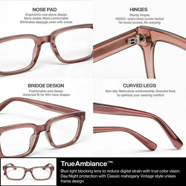 • COMFORTABLE TIMELESS FRAME: Classic mahogany acetate frame suits any face shape. These computer glasses for women and computer glasses men combine style and comfort, ideal glasses blue light users who value both fashion and function.
