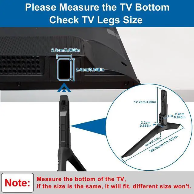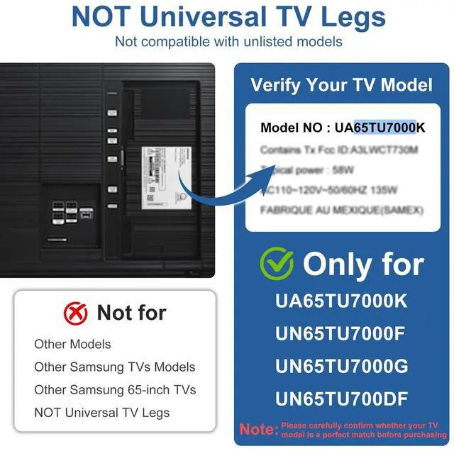 TV Legs Replacement NOT applicable---1. NOT universal TV legs 2. NOT for all Samsung TV 3. NOT for the unlisted Samsung TV models, only suitable for the 4 TV models listed ^^ Only Compatibility---The TV legs replacement only for