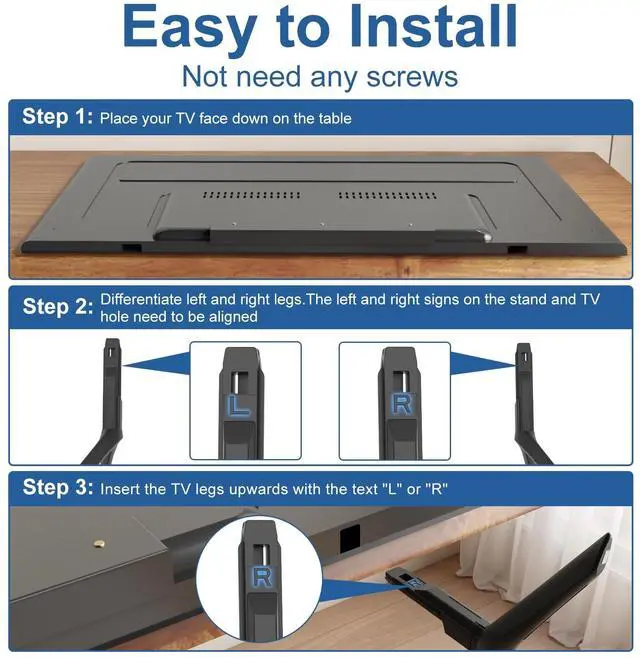 Note: Only for the models we listed, not for others and not universal tv stand. Please double check before order. ) ^^ Quality & Stability--- Our TV stand legs for Samsung TV stand base are made of PP GF4 material, strong but not thin. It can support your TV sturdily and stably ^^ Cable Management Solution---Tired of tangled wires? Our TV stand comes with 2 cable ties and they are shipped stacked together. Before use, please separate them manually, then use them to bundle your wires for a neater TV setup ^^ Easy Installation---No screws needed, just lay down your TV first and then follow the mark sign "L" and "R" to put the tv legs inside your TV bottom. 2 steps in 3 minutes, you can finish the installation. So easy, save your time, no need to go out for screws ^^ Anti-scratch & Non-slip---Don't worry about shaking easily after installing our tv legs. It is designed with high quality foot pads. And it has been tested and it does not slide easily or scratch on your table, desk or TV cabinet ^^ Package List---1 x "R" TV stand legs for Samsung 65 inch tv stand legs, 1 x "L" TV stand legs for Samsung 65 inch tv stand legs (Not included screws because not required), 2 x Cable ties