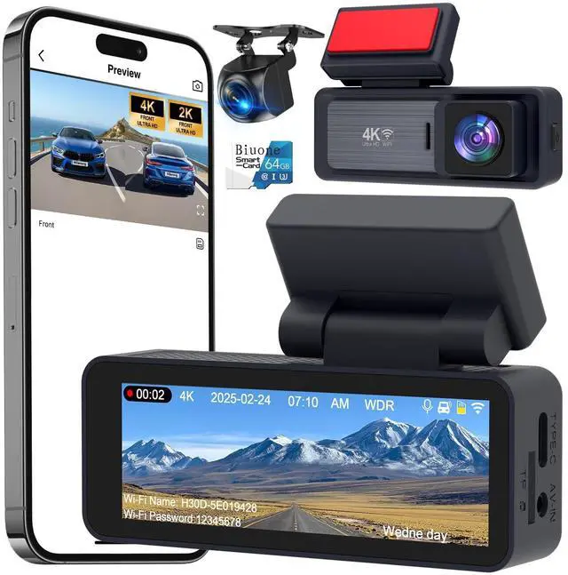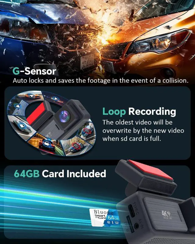 With Biuones advanced safety alerts, enjoy a smarter and more secure journey on the road ^^ [Super Night Vision Dash Cam] --- This dash cam is equipped with a premium F 1.5 aperture and a 6-layer optical lens, enhanced by WDR (Wide Dynamic Range) technology. Its advanced night vision system ensures exceptionally clear footage, capturing vivid colors and true-to-life details even in low-light or complex lighting conditionshelping you drive with greater confidence after dark ^^ [4K Loop Recording with 64GB Card & G-Sensor Dashcam] --- The included 64GB SD card provides ample storage for your recordings (compatible with cards up to 512GB).