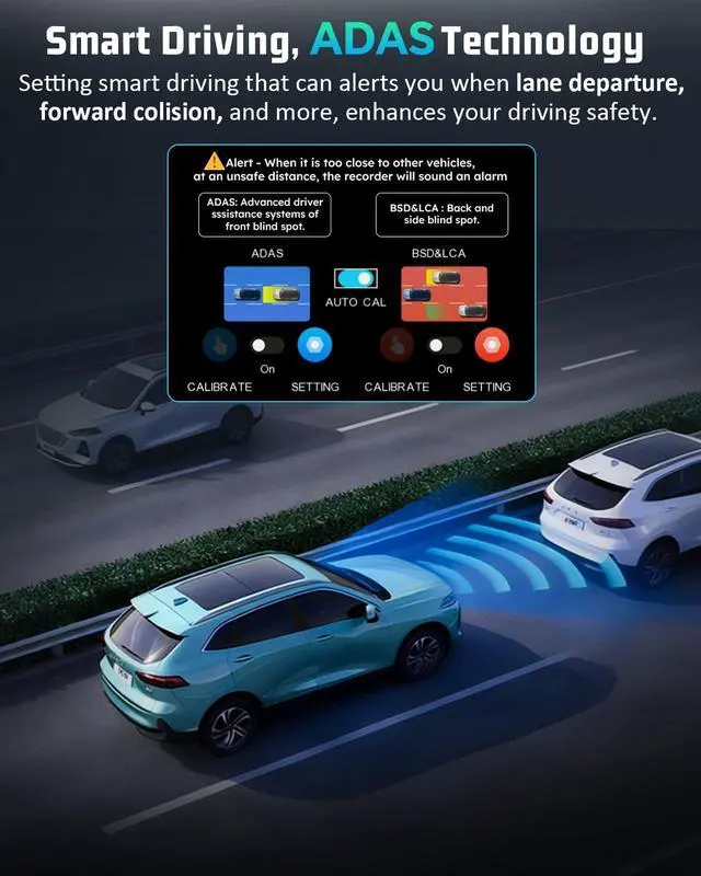 Through the dedicated app for iOS and Android, you can easily view live footage, play back recordings, and download videos right to your phoneallowing you to instantly share moments on the road. This dual dash cam captures both front and rear views at the same time and displays them clearly on a vibrant 3.2" screen ^^ [Smart Driving ADAS System] --- Your Reliable Co-Pilot This dash camera features ADAS (Advanced Driver-Assistance System) technology, designed to detect nearby obstacles and provide timely alerts for safer driving. Its intelligent Blind Spot Detection (BSD) monitors hard-to-see areas and warns you during lane changes.