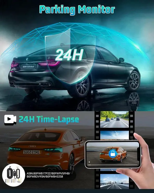 When the memory card reaches full capacity, the dual dash cam automatically overwrites the oldest footage with new video, ensuring continuous loop recording. Its built-in G-sensor instantly detects collisions while driving, locking and protecting crucial footage from being overwritten ^^ [24-Hour Parking Monitor & Time-Lapse Recording] --- Safeguard your vehicle day and night with the dash cam's 24/7 parking surveillance mode (requires a hardwiring kit, sold separately). The time-lapse function captures footage at a reduced frame rate, enabling continuous monitoring while optimizing power efficiency and preserving your vehicle's battery life ^^ [Perfect Present W/ Reliable After-Sales Support] --- This dash cam makes an excellent gift for birthdays, holidays, or any occasion for friends and family.