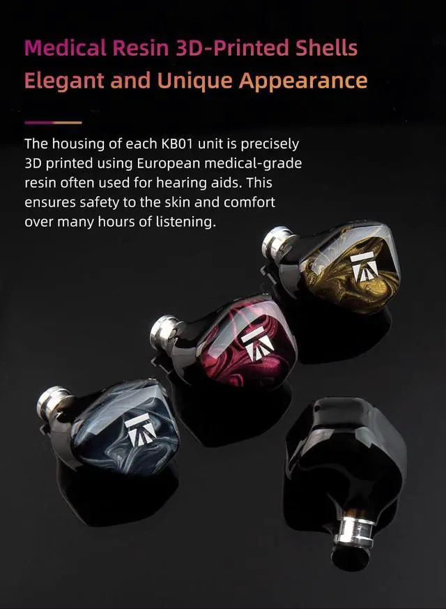 Beryllium Diaphragm Dynamic Driver IEM in ear MonitorsIts time for inears wired earbuds with unclear sound quality to step aside. KBEAR KB01 iem earphones gaming equipped with 1DD 10MM Beryllium Diaphragm Dynamic Drivers (always used for Hi-end level gaming headphones), The sound is balanced, clear, and well analyzed, let you find more details and pleasures from music. ^^ 3D-Printing Technology, Small Cavity with ResinThe housing of each kbear KB01 inear earphones is precisely 3D-printed using resin, elegant and unique appearance, smooth cavity and small earbuds' body, lightweight (only 4 grams single earbuds), which ensures safety to the skin and comfort over many hours of listening.