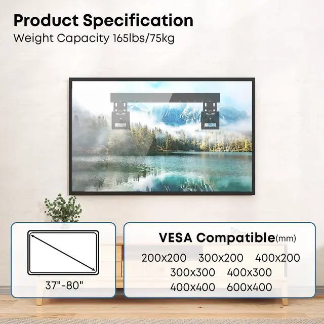 : Crafted from high-quality sheet metal with a robust structure, this slim mount is designed to accommodate most 37 to 80 inch TVs, supporting weights of up to 75 kg (165 lbs). It also includes magnetic connectors to securely hold the TV in place and prevent any shifting ^^