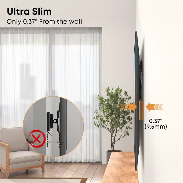 Micro Gap Design: This slim and sturdy TV wall mount, equipped with micro gap functionality, allows you to mount your television just 9.5 mm ( 0.37 inches) away from the wall. Effortlessly snug your TV against the wall, create more space in your home, and infuse your living space with a modern minimalist style ^^