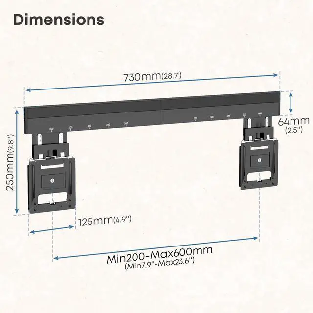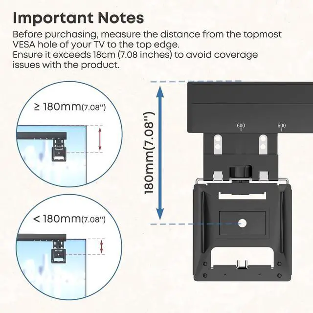 Tips: Before purchasing, please measure the distance from the topmost VESA hole of your TV to the top edge of your TV to see if the distance is more than 18 cm( 7.08 inches). If not, it will appear that the TV can't cover the product. If you mind, please buy with caution ^^