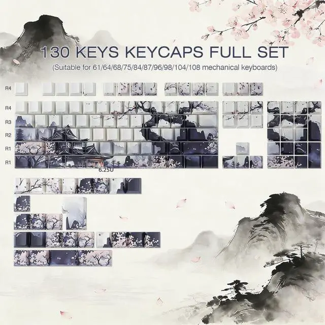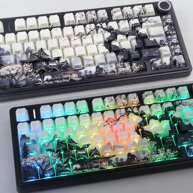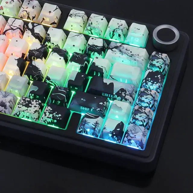 Ethereal Moonlit Night AestheticImmerse yourself in a serene landscape with these keycaps, featuring a beautiful Chinese ink wash painting design. The artistic depiction of a tranquil moonlit night over mountains and water brings a touch of Zen and sophisticated artistry to your keyboard. ^^ Premium Dye-Sublimation PrintingThe intricate ink art is applied using advanced dye-sublimation technology. This ensures the designs are deeply infused into the PBT material, resulting in vibrant, fade-resistant legends that will not wear off, even after years of heavy use. ^^ Subtle Side-Legend Shine-ThroughEnjoy the best of both worlds: a pristine top surface for an authentic art piece look, and clean, laser-etched side-legend characters that allow your RGB backlight to shine through. This creates a soft, ambient glow that highlights your keyboard's layout without disrupting the artwork. ^^ Durable & Textured PBT MaterialCrafted from high-quality PBT plastic, these keycaps are resistant to the oily shine that plagues cheaper ABS keycaps. They offer a satisfying textured feel, excellent durability, and ensure a consistent typing experience that lasts. ^^ Universal Compatibility & Perfect FitThis 133-key set provides ample coverage for most full-size, TKL, and 75% layout mechanical keyboards. Designed with a Cherry profile and standard MX stems, they offer a comfortable typing angle and are compatible with the vast majority of switches (Cherry MX, Kailh, etc. ).