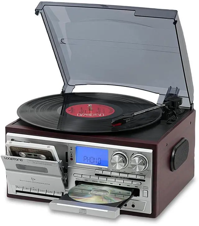 AM/FM Radio: This record player is not only a vinyl player but also a multi-functional player. It has a CD player and a cassette player. You can play your favorite CDs or cassettes on this record player. The record player also features an AM/FM radio with digital LCD display, allowing you to listen to your favorite radio stations. ^^ Aux-in and RCA line-out, which allows you to connect your non-Bluetooth devices to the record player, such as your MP3 player, PC, laptop, tablet, or other audio devices. You can also use the RCA line-out to connect to your home audio system, which brings you more choices for enjoying music. ^^ Recording vinyl to MP3 or cassette, let you have more ways to listen to your vinyl record. Blue LED light display makes you to view the working situation in any mode more easily. Including remote control, Make it easier to control the record player. You can remotely control mute, play / pause music, switch modes, and so on.