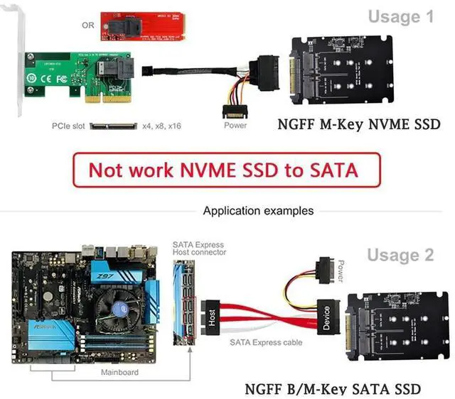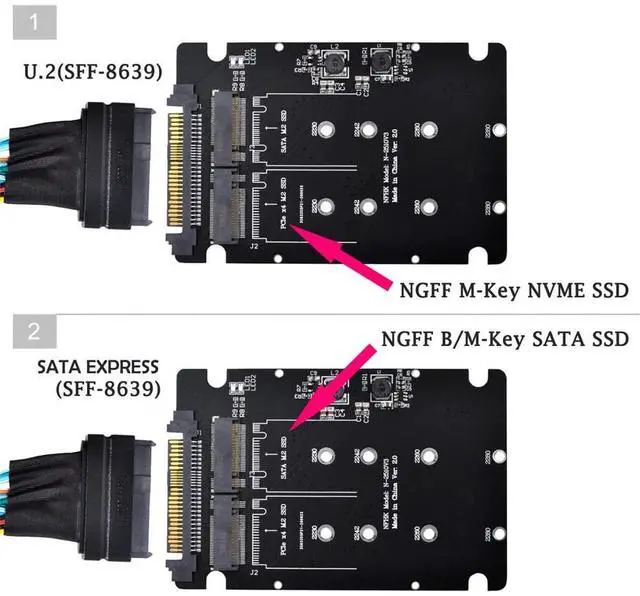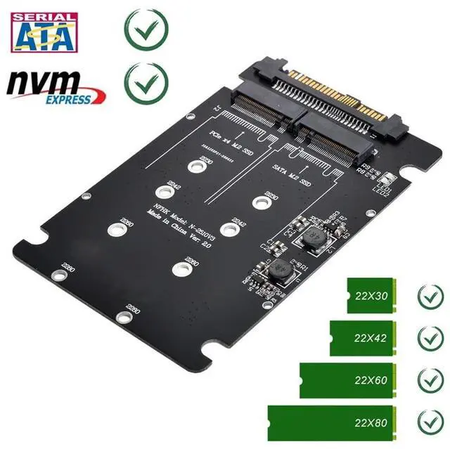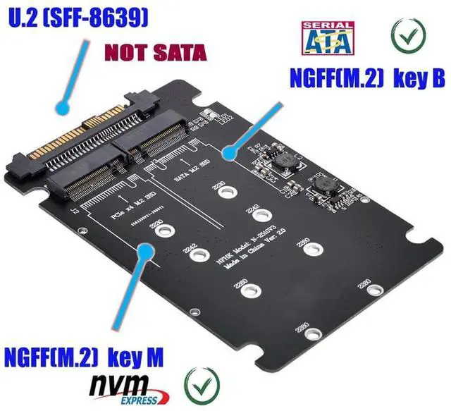 SFF-8639 NVME U. 2 to Combo NGFF M. 2 M-key SATA PCIe SSD Adapter for Mainboard Replace SSD 750 p3600 p3700This U. 2 M. 2 converter enables two different usage applications. 1. One M. 2 PCIe SSD in 2280, 2260, 2242 and 2230 format can be connected and used as a replacement for a 2.5 HDD. The converter can be installed into the system internally through the U. 2 68 pin interface. 2. One M. 2 SATA SSD in 2280, 2260, 2242 and 2230 format can be connected and used as a replacement for a 2.5 HDD.