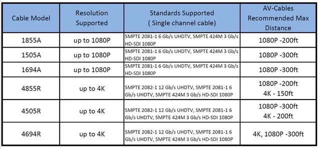 AV-Cables 75 Ohm RG6 3G/6G Precision HD SDI cable is ideal for short to long runs of SDI. The Belden 1694a RG6 cable features a solid center conductor, double shielding and a foam dielectric for minimal signal loss. Conforms to SMPTE 259M, 292M, 424M and ST-2081 standards. This 6G HD SDI cable swept to 6G to deliver 1080P HD video and beyond. UL listed type CMR making it an ideal choice for in wall cables. Cable is backed by a lifetime connector replacement warranty.