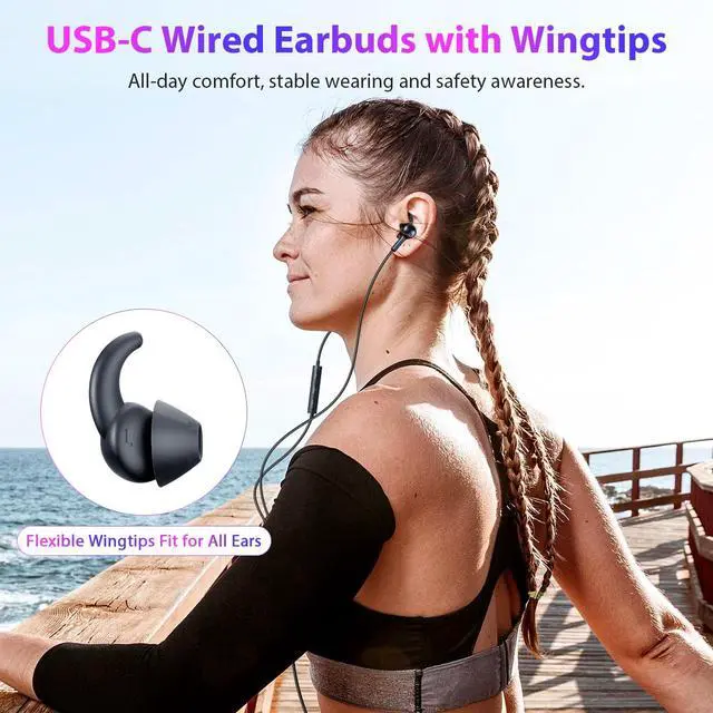 Improved Comfort Design: The running USB-C headphones improved with flexible soft wingtips, increase earbuds comforty and stability whatever workout or just staying sofa; Remember to replace the suitable wingtips for best listening experience ^^