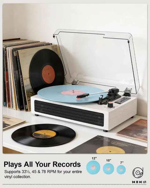 Bluetooth Record PlayerVersatile Connectivity Stream music wirelessly via Bluetooth, play MP3/WAV files from USB/SD cards (up to 64GB, FAT32 format), or connect via AUX In/RCA out for external speakers. RCA stereo outputs let you connect to external speakers for enhanced sound ^^ 3-Speed Belt-Drive TurntableRecord Player offers a range of 7", 10" and 12" vinyl records, with speeds of 33, 45 and 78 RPM. Auto-stop protects records, while anti-vibration platters reduce noise. The vinyl player includes 45 speed adapter. Maintaining precise control over speed is essential for achieving optimal audio performance ^^ All-in-One TurntableEnjoy high-quality audio from the built-in stereo speakers.