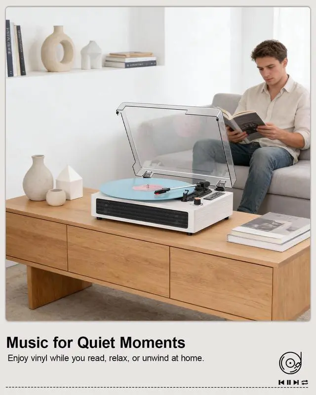 For more versatility, connect via Bluetooth, AUX-in, or RCA cable. Seamlessly switch between playing vinyl and wireless streaming sources. The turntable also features an auto-stop function, enhancing the listening experience ^^ Designed for Joy, Wrapped in AssuranceThe Perfect Gift, Thoughtfully crafted for first-timers and a wonderful gift for any occasion. LED Display Designed for intuitive use, Experience the joy of vinyl with hassle-free operation. To give you complete peace of mind, it's supported by our friendly team and a full one-year warranty ^^ Modern Tech & Minimalist DesignA seamless blend of nostalgic warmth and contemporary simplicity.