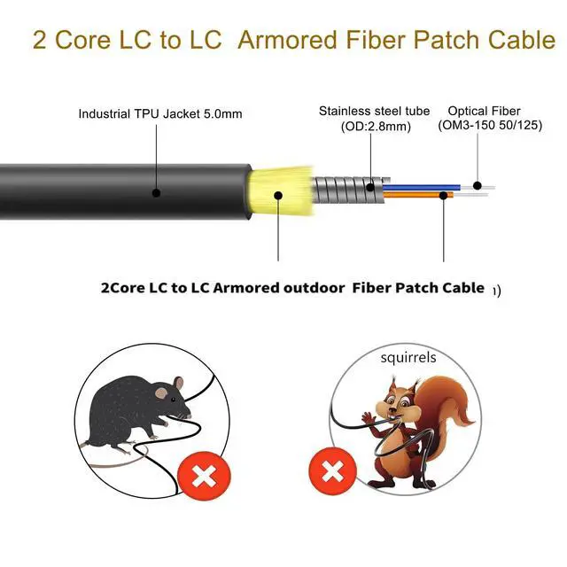 The OM3 LC to LC outdoor fiber optic patch cable, with an industrial TPU jacket, is designed to be strong in tensile strength, highly wear-resistant, waterproof, and can endure high and low temperatures. It is also UV-resistant and bend resistant ^^ The OM3 fiber optic cable is suitable for various harsh installation environments such as roads, snowfields, industrial fields and construction sites, Can be installed overhead, buried directly in the ground, or routed through conduits ^^ The outdoor armored Fiber Patch Cable uses a stainless steel spiral armor tube to provide sturdy protection for the inner core (glass fiber) against damage from rodents and other external factors ^^ The uniboot design allows one cable to carry two fibers, reducing the cable bulk when routing.