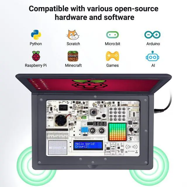 Portable Laptop: CrowPi 2 is designed as a compact, portable laptop and an advanced STEAM education platform that integrates Raspberry Pi support, built-in sensors, and self-developed tutorial software perfect for students, makers, and educators alike. (Raspberry Pi 5 not included) ^^ Built-In Sensors & GPIO