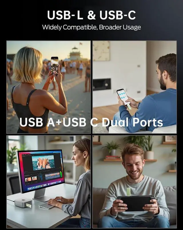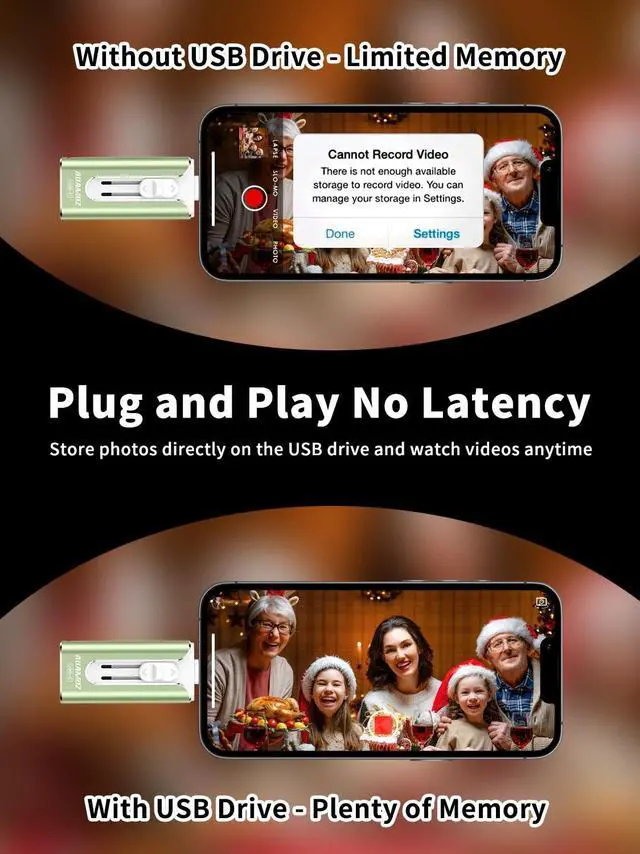 (Note: For iPhone/iPad No App Required; For Android only Needs OTG Enabled, No Extra App. ) ^^ Universal Compatibility with Dual InterfacesFeaturing USB-C, USB-L, USB ports adapter, this Compatibility iPhone photo storage stick connects seamlessly with iPhone/iPad devices, Android OTG phones, laptops, and tablets. No iCloud fees, no internet requiredjust plug in and move files freely between your phone, computer, and other devices. ^^ Blazing Fast Transfers AnywhereFeaturing upgraded high-speed chips, this portable phone external storage drive enables instant mass file transfersup to 30 MB/s read speed and 15 MB/s write speedno WiFi or data cables required. Save time sharing photos, moving large video projects, whether youre traveling, working, or creating content on the go. ^^ Easy Backup, Enjoy Anytime AnyplacePlug-and-play & simple to operatequickly back up videos, photos, contacts and documents without tedious copying or pasting. No third-party apps required; just plug the drive into your iPhone, iPad or Android device and operate via the "Files" app. You can also share files directly from the iPhone photo stick to social media, instantly sharing wonderful moments with friends and family.