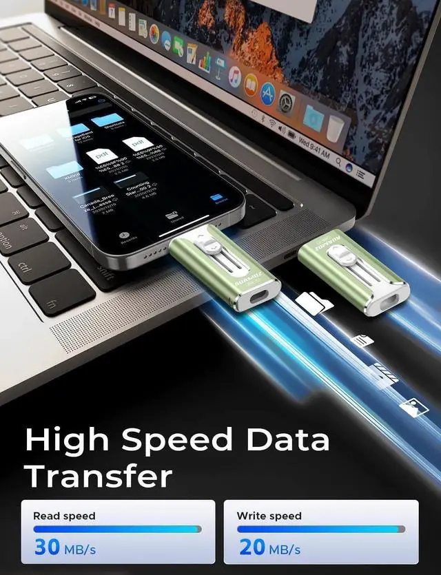 Higher: Simply insert the flash drive into your iPhone iPad, then go to the "Files" app, Click back to Browse and find the flash drive named Untitled, Move photos videos and files to your iPad or iPhone as needed. ^^ How to transfer in Android PhonesAndroid phones need to support OTG, and flash drives can be found in the File Manager of most Android devices. ^^ Kindly NoteThe phone case may prevent the proper connection between a phone and a usb flash drive, which could result in the phone being unable to recognize the usb flash drive. In this situation, please do not conclude that the usb flash drive cannot be used, remove the phone case and try again. ^^ Kindly NoteFor Flash Media Devices, 1 megabyte = 1 million bytes; 1 gigabyte = 1 billion bytes. Actual useable capacity may vary. Some of the listed capacity is used for formatting and other functions, and thus is not available for data storage. ^^ Kindly NoteUp to 30MB/s read speed, write speed is lower. Based on internal testing; performance may be lower depending on the host devices and users settings and configurations.