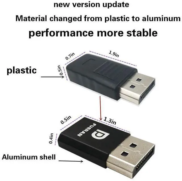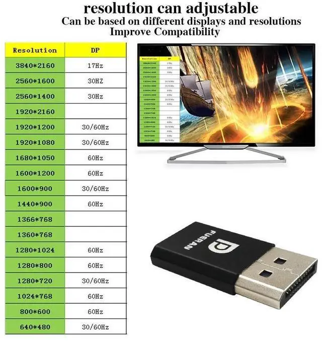 DP supports different resolutions from 800600 up to 2560x1600@60Hz display port dummy plug. ^^ For game-streaming at high refresh rate use FUERAN-Headless GS. ^^ More resolution than defaults. 800600Up to 2560x1600@60Hz ^^ Plugs into DP port, does not require additional power ^^ Headless Mac/ Windows/ Linux detect a Digital monitor, Ultra-compact, low profile design No drivers, no configuration, no power cable - just set and forget Allows for high (HDMI2K, 4K, VGA, DVI, MINIDP)HEADLESS, (HDMI, VGA, DVI)PASS-THROUGH EDID PLEASE ENTER THE STORE TO PURCHASE