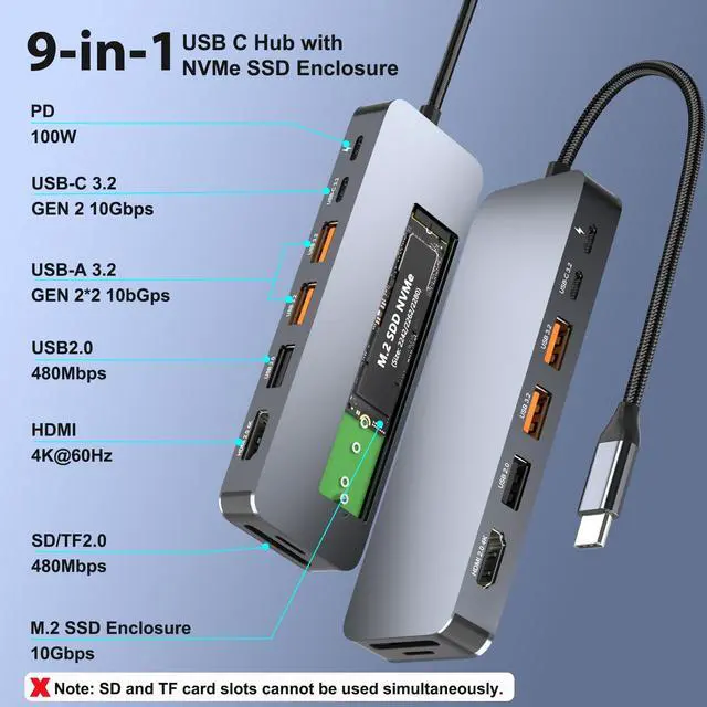 9-in-1 USB C Hub with NVMe SSD EnclosureCombine a high-speed M. 2 NVMe SSD enclosure with a full-featured USB-C docking station.
