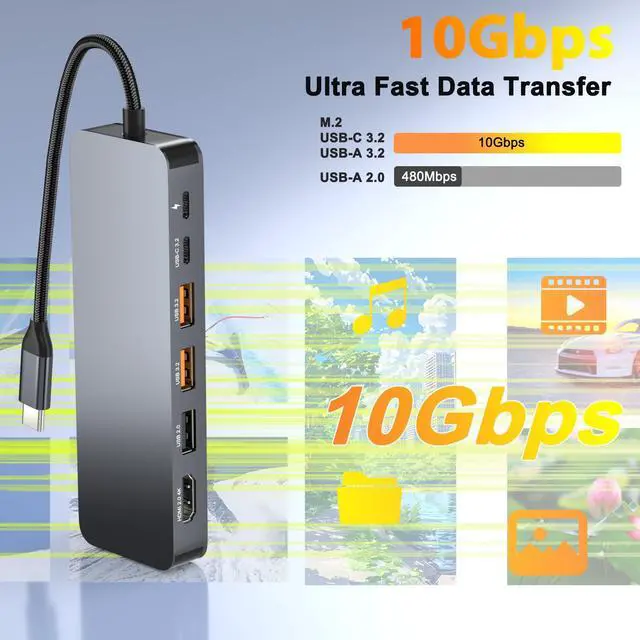 Please Note: The built-in SSD slot supports PCIe NVMe SSDs only (M-Key, up to 4TB capacity) and is not compatible with SATA M. 2 SSDs. Expand your laptop's connectivity with a 4K@60Hz HDMI port, 100W PD charging, a USB-C 3.2 Gen2 data port, dual USB-A 3.2 Gen2 ports, a USB-A 2.0 port, and an SD/TF card reader. Perfect for work, gaming, or travel. For optimal performance, use a PD power adapter (not included). ^^ Ultra-Fast 10Gbps Data Transfer & Card ReaderExperience blazing-fast file transfers with USB 3.2 Gen2 technology, moving a 1GB file in just one second. The built-in SD/TF card reader (up to 30MB/s) allows for easy import of photos and videos from cameras, drones, or action cameras. A dedicated USB-A 2.0 port is ideal for low-power peripherals like wireless keyboard/mouse dongles.