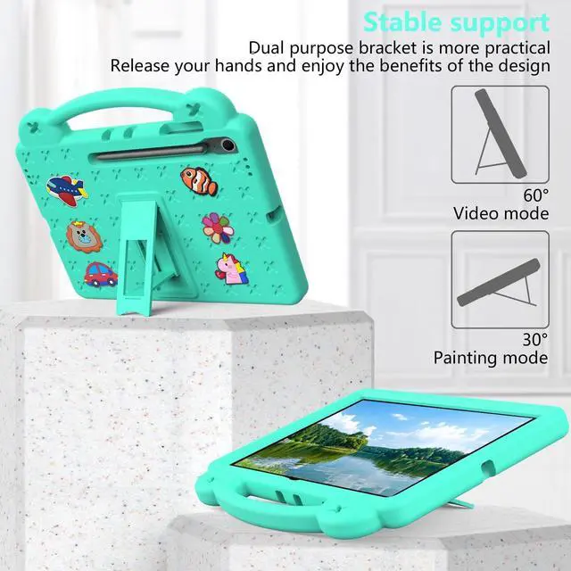 (Note: the product does not contain screen protector) ^^ [Cute DIY Design] There are some cute cartoon doll on the back, you can insert them into the holes on the back. ^^ [Sturdy Stand & Shoulder Strap] The built-in PC stand firmly supports the tablet, allowing you to watch videos comfortably. The shoulder strap allow you to carry the tablet easily. ^^ [Non-slip Handle] Portable handle, elegant design, allows children to take out the tablet easily.