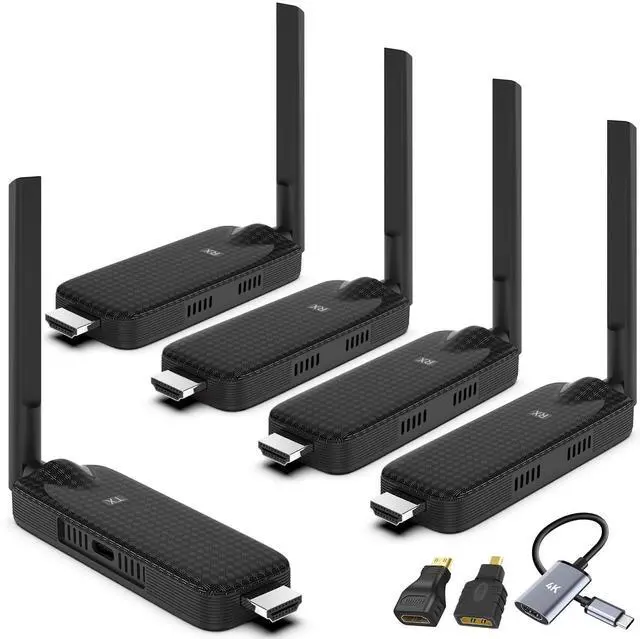 Multiple Screens Expand SimultaneouslyThis multi-screen extender features a new design, 4 receivers and 1 transmitter, wireless video to multiple tvs. Each transmitter is connected to up to 4 receivers. Streaming smooth video and audio to multiple displays all at once is a breeze! seamlessly syncing streaming video, audio, presentations, games, and more to multiple TV screens, say goodbye to lags and tangled cable. ^^ Plug & PlayThis New Upgrade wireless HDMI transmitter and 4receiver is auto-paired before the factory, which is truly plug-and-play. No apps, no bluetooth, and no Wi-Fi are required.
