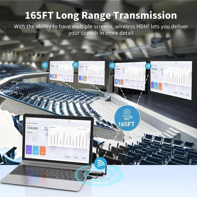 (Note: Please be sure to distinguish the transmitter (TX) and receiver (RX) before hooking it up. ) ^^ 165FT/50M Wireless TranmissionThis Ultra-Long-Range stable splitter utilizing a 2.4G /5G transmission protocol, the signal is stronger and more stable, extending the transmission range up to 165FT/50 meters in line of sight. Ideal for business meetings, teaching, watching movies, football games, family gatherings, birthday parties, and more.