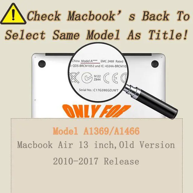 Case Only Compatible with: Model A1369/A1466 (Macbook Air 13"/ 13.3", Old version, Release 2010-2017)We provided the model number location picture at the picture section. Please check your Macbook model "Axxxx" on the back of the laptop and order the correct model protective case.