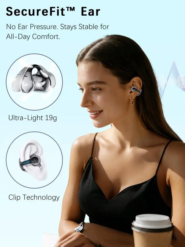 • Ultra-Light Clip Design 24H Comfort FitExperience all-day comfort with our upgraded SFE Ear-Fitting technology, soft skin-friendly memory silicone, and a flexible memory titanium C-bridge. Each earbud weighs only 5g, delivering a secure, glasses-friendly fit that stays put even during intense workoutsno slipping, no pressure, no fatigue.