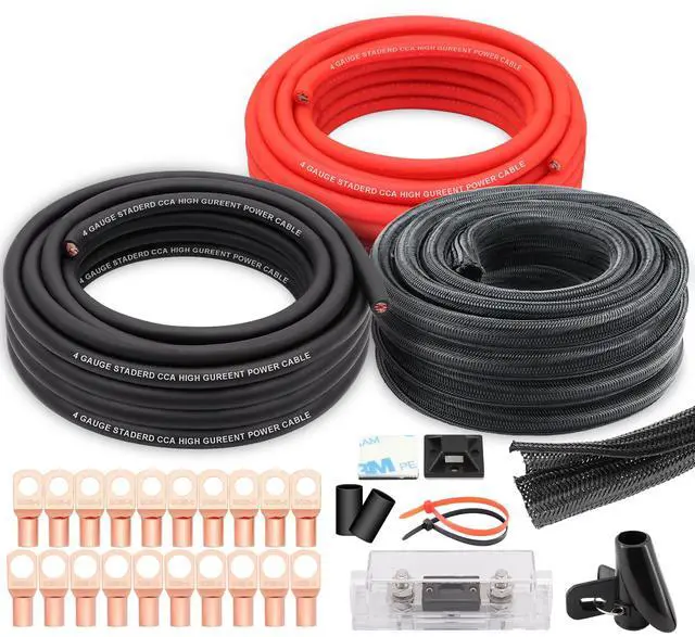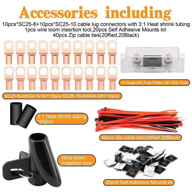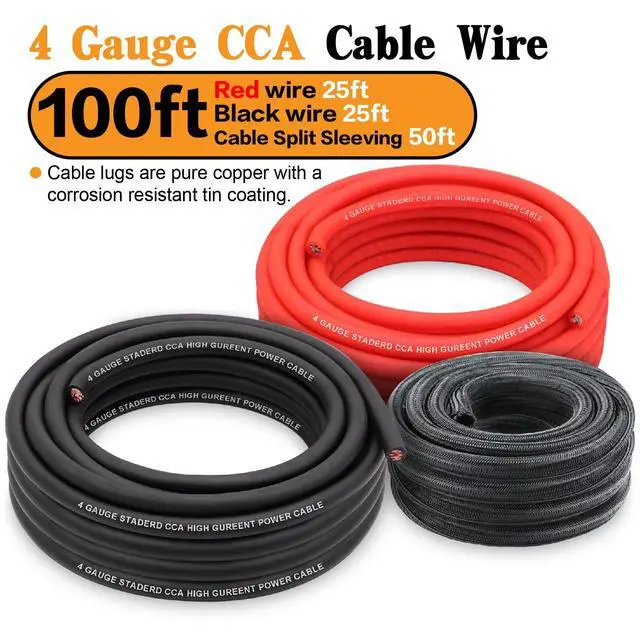 PACKAGE INCLUDED: 50FT 4 Gauge Wire Copper Clad Aluminum CCA (25ft Each for Black and Red), ANL Fuse Holder w/ 100 AMP ANL Fuse, 10PCS AWG4-5/16(SC25-8) lugs, 10PCS AWG4-3/8(SC25-10) lugs and 20pcs 3:1 Adhesive Lined Heat Shrink Tubing. 50FT 1/2 inch Cord Protector Cable Sleeve Split Sleeving, 1pc wire loom insertion tool, 20pcs Self Adhesive Mounts kit, 40pcs Zip cable ties(20Red, 20Black) ^^ COPPER CLAD ALUMINUM (CCA) - The CCA cable is the most economical option for choosing power or ground wire. Copper coated aluminum gives you an economic power cable with excellent power transfer. Systems that require more power should use ofc cable wiring. ^^ POWER / GROUND WIRE KIT - With lugs and Heat Shrink Tubing. the power wire set is great for a car amplifier or subwoofer or to be used as a ground wire on your electric wire installs. ^^ Size for Wire Loom Cable