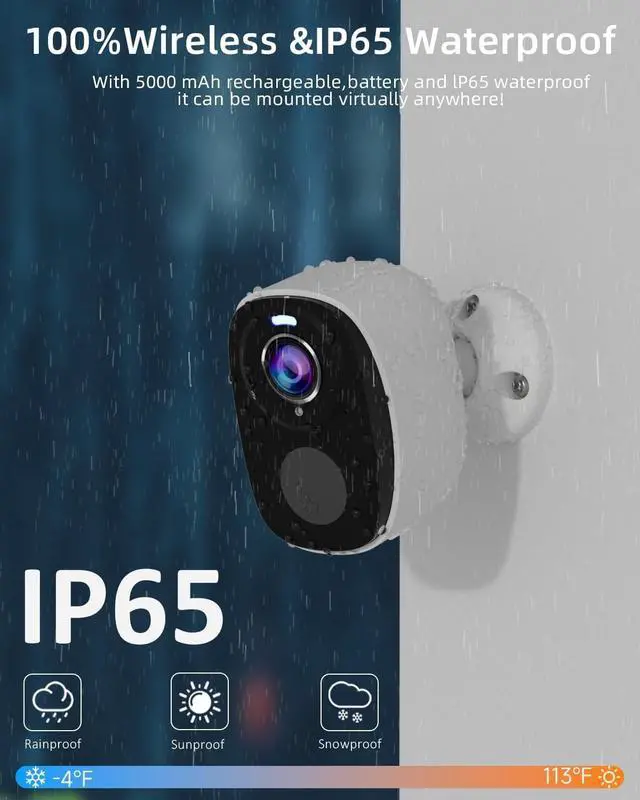 2.4 &5Ghz-Wifi Cameras ELECCTV This cameras for home security, with its advanced 2.4GH z and 5GHz dual-band wireless connectivity technology, offers swift and reliable network connections. Moreover, this security camera features a one-touch quick setup function that significantly simplifies the installation and configuration process, eliminating the need for complicated setup steps. ^^ 100% Wire-Free & IP65 WaterproofELECCTV security camera contains a rechargeable battery, with a variety of power-saving modes to set in the APP, the camera can be used 1-3 month after full charging. The completely wireless camera of the IP65 waterproof level can be easily installed anywhere ^^ 2K QHD Live Video & Color Night VisionThe lens of the security camera adopts a 130 wide-angle design, which can be seen to obtain a wider field of view.