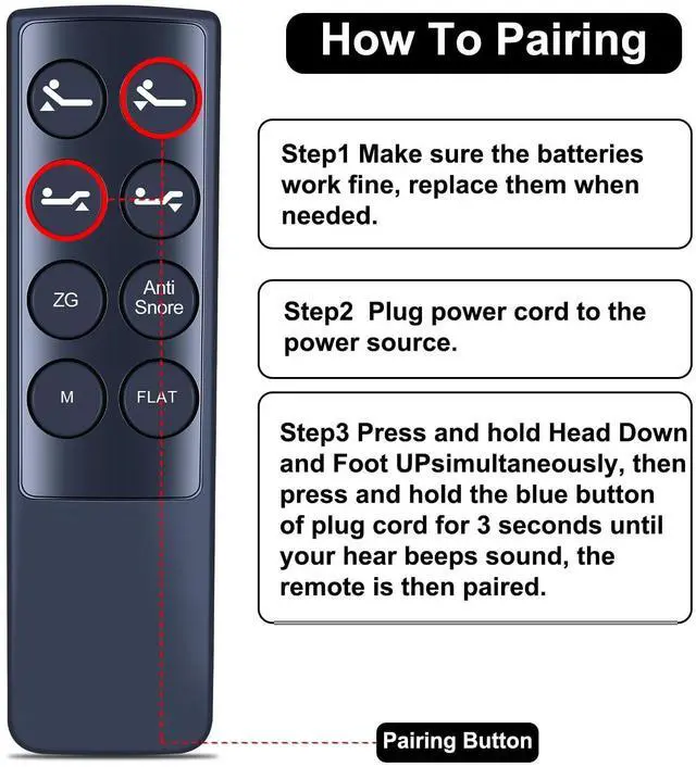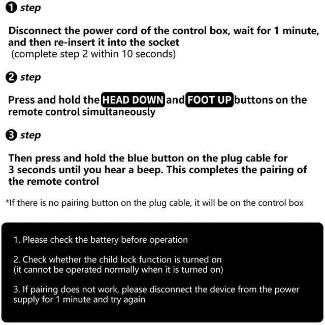 Please Set Before Use. Step1) Make sure the batteries work fine, replace them when needed. Step2) Plug power cord to the power source. Step3) Press and hold Head Down and Foot UPsimultaneously, then press and hold the blue button of plug cord for 3 seconds until your hear beeps sound, the remote is then paired.