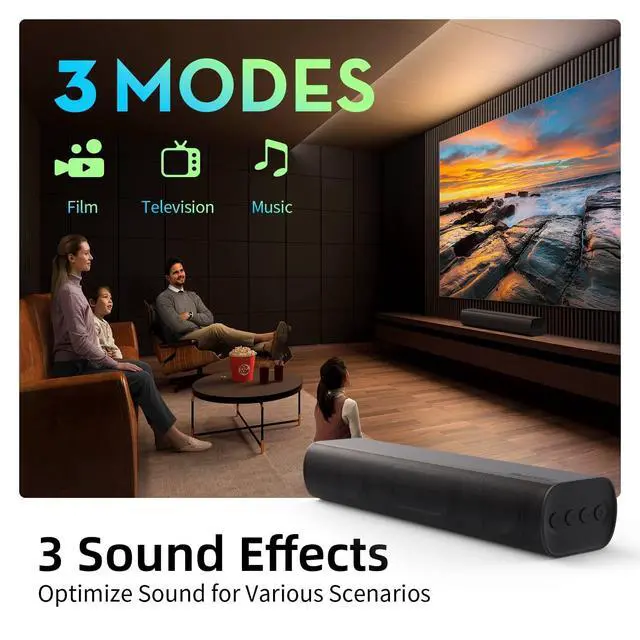 50 Watts Bass BoostBluedee sound bars for TV feature 2 large bass radiator units releasing room-filling sound and deep impactful bass. Come and enjoy this feast for your ears. ^^ 4 Ways To ConnectBluedee soundbar for TV provide multiple ways to connect: Bluetooth, Optical, 3.5 mm Aux, 3.5 mm Aux to RCA (Included). Connection has never been this easier. ^^ 3 Sound EffectsOne piece TV sound bar design but not simple as it seen. Built-in DSP technology supports 3 EQ modes, optimize sound for various scenarios(movie, music, news). ^^ 2 Ways to ControlBluedee TV speakers sound bar comes with 4 side control buttons and a remote commander that helps you up and running in seconds. Sit and start without the user manual. ^^ Compact Profile DesignCrafted to enhance modern living spaces, Bluedee sound bar is perfect for easy placement under your TV or wall mounting. The speaker measures 16.2" W x 3.9" D x 2.8" H. ^^ No Extra Accessories NeededWe've included everything you require: Optical cable, 3.5 mm AUX cable, RCA cable, wall mounting template and kit, and more. ^^ Trustworthy After-SalesOnce purchased, you are our valued customer entitled to lifetime after-sales service. Should you have any queries or require technical help, contact us via messages or the contact information in the user manual.