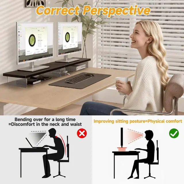 Appropriate SizeSize: 31.5"L X 7.87 "W, This stand can accommodate two monitors, one laptop or one TV, making it an excellent solution for users who need multi-device workstations. ^^ Durable ConstructionCrafted from wood and sturdy acrylic, this Wood & Acrylic Computer Monitor Stand is designed for durability and stability, ensuring your monitor stays securely in place while you work. ^^ Multi-Purpose StandThis monitor riser offers a versatile and efficient workspace. It can be used as a computer monitor stand, laptop stand, printer stand, TV stand, or as additional shelving. The design also provides under-monitor storage space for a keyboard or other accessories, enhancing desktop organization. ^^ Ergonomic HeightBy elevating your monitor to the optimal ergonomic viewing height, this riser helps improve posture and significantly reduces the risk of neck strain and discomfort. ^^ Easy to InstallAssembly can be completed in approximately 5 minutes. The package includes all necessary tools and a detailed instruction manual. Should you have any questions or require assistance, our customer support team is available to help.