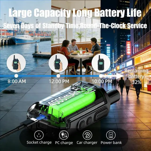 Battery Life]: Global walkie talkie unlimited range Featuring a powerful 4000mAh battery with a built-in flashlight, this nationwide ptt walkie-talkie (measuring 3.58" 1.61" 1.34" ) supports all-day talk time and up to 7 days on standby. It supports multiple charging methods, including advanced USB-C fast charging, offering a fast and convenient charging experience. A single full charge keeps you connected through extended outdoor adventures. ^^ [Enterprise Long-Range Walkie-Talkies with